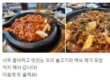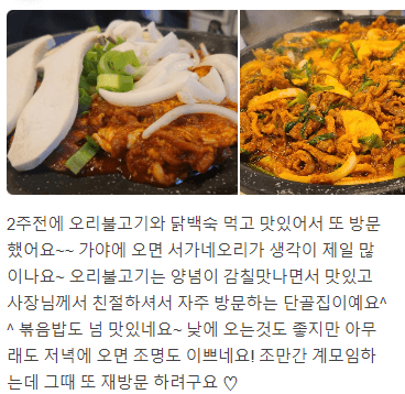 2. 너무 좋아하고 맛있는 오리 불고기와 백숙 제가 포장까지 해서 갑니다! 오리 고기 맛집입니다!