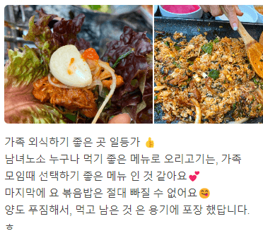 • 메뉴&가격 : 간장 오리불고기(가족 3~4인) 59,000원 고추장 오리불고기(가족 3~4인) 59,000원 한우 비빔국수 6,000원 일등가 들깨수제비 7,000원 볶음밥(셀프) 3,000원 등 메뉴 자세히 보러가기