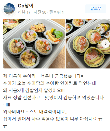 특징 : 20,21,22 [3년 연속 네이버 주문어워즈 수상]/ 2022 김슐랭 가이드 BEST 김밥/ 서울 고객 만족도 설문조사 4.95(5점)/ 네이버 영수증리뷰 우수업체 4,88(5점)/ 포장, 배달, 제로페이, 반려동물 동반이 가능합니다.