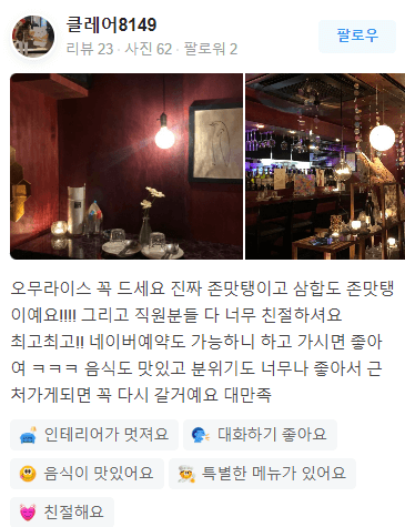 - 음식도 맛있고 분위기도 너무나 좋아서 근처가게되면 꼭 다시 갈 거예요 대만족입니다.