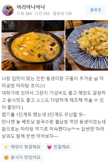 - 진짜 마라탕 먹는 느낌이라 재방문 많이 할 것 같아요
