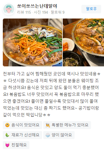 - 음식은 맛있고 양도 둘이 먹기 충분했어요. 역시 맛집입니다.