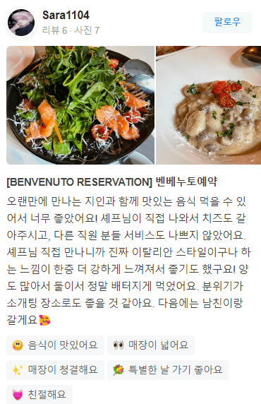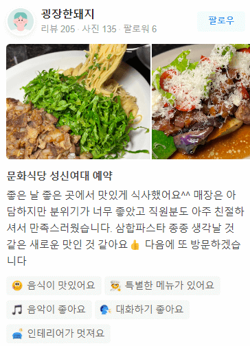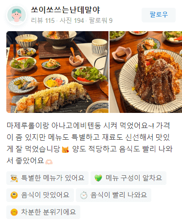 - 음식도 맛있고 분위기도 너무나 좋아서 근처가게되면 꼭 다시 갈 거예요 대만족입니다.