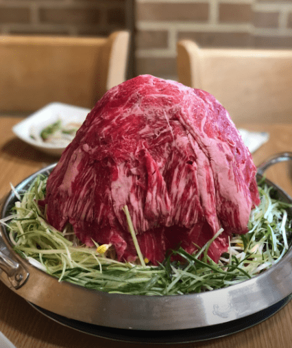 - 산더미물갈비 소 (49,000원): 한우고기 한 겹씩 내려서 익혀먹는 갈비요리로, 안에는 갈비, 콩나물, 떡, 버섯 등이 들어있습니다.