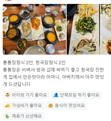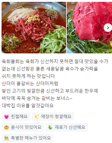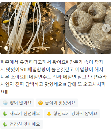" 맛이 깔끔하고 텁텁한 맛이 없어서 개운하고 집에 와서도 생각나는 맛이에요. "