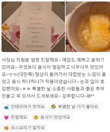" 이 가격에 이 정도 코스면 진짜 너무 좋고, 효자동 맛집인 만큼 정말 맛있게 잘 먹었어요 "