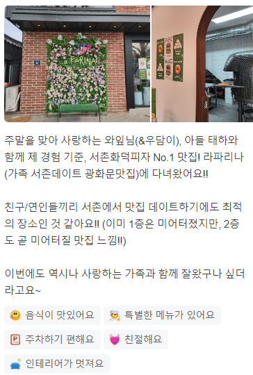 " 분위기 진짜 좋고 데이트 장소로도 추천드리고 분위기, 맛 모두 적합한 효자동 맛집이었어요 "