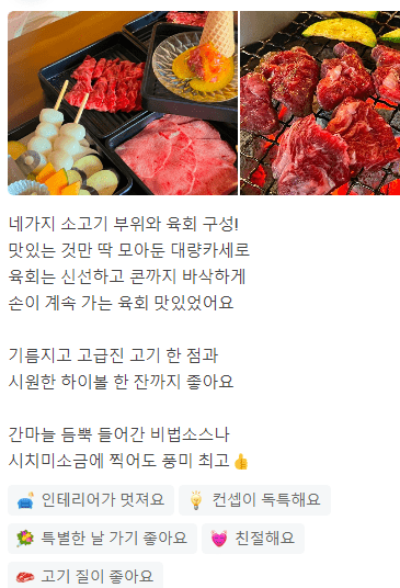 " 매장도 예쁘고 분위기 좋았고 음식이 정갈하고 너무너무 맛있어요. "