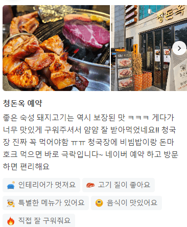 - 예약 및 편의: 단체석, 예약, 무선 인터넷, 남/녀 화장실 구분