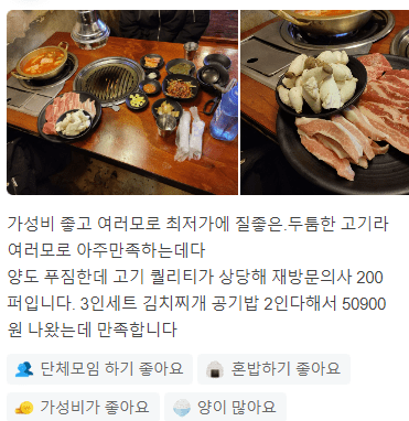 " 가성비 좋고 여러모로 최저가에 질 좋은, 두툼한 고기라 여러모로 아주 만족했습니다 "